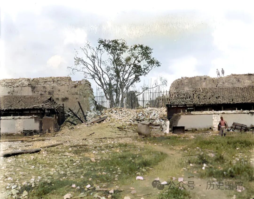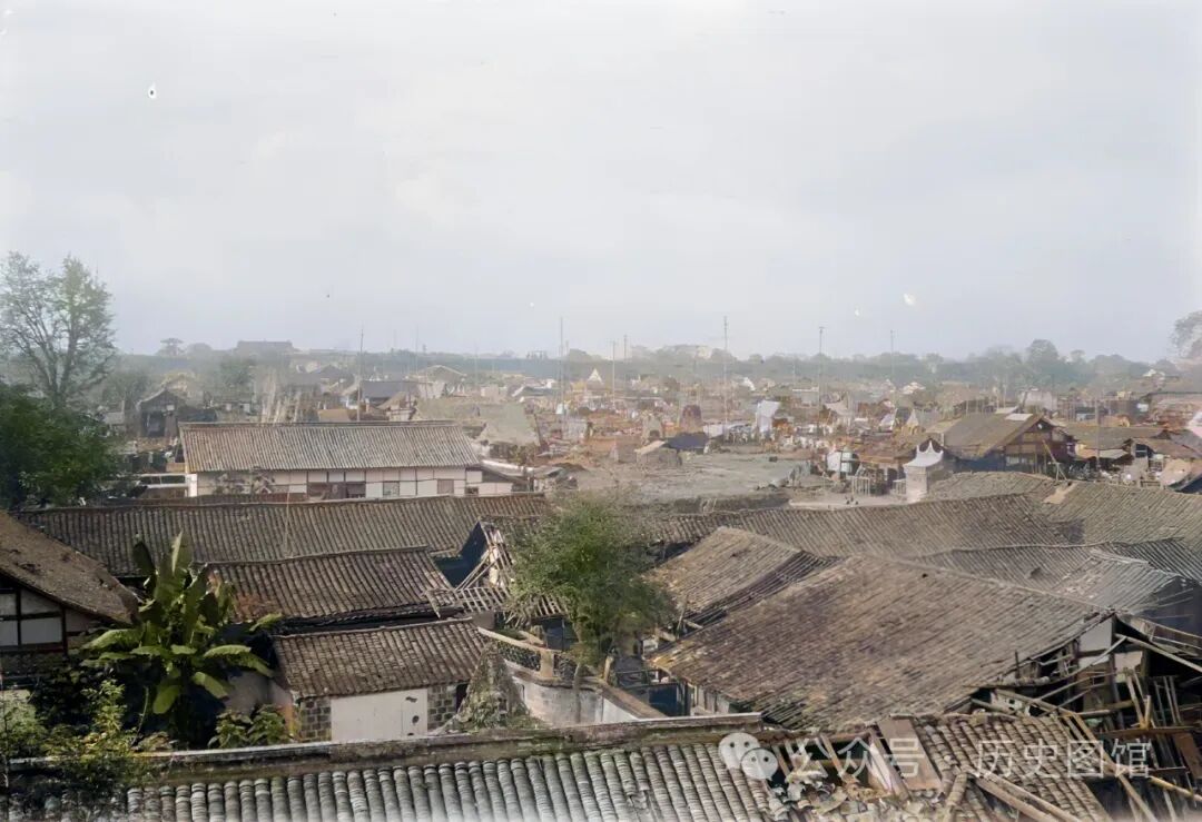 近处的一些民房,屋顶出现了坍塌,这也是军阀混战的造成的结果。1917年4月中旬,川滇两军爆发大战,城内很多建筑遭到损毁。