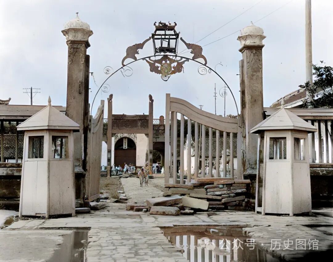 这里是当时位于成都的四川督军署。大门口堆砌有石块掩体,两个岗亭里并没有哨兵守卫。