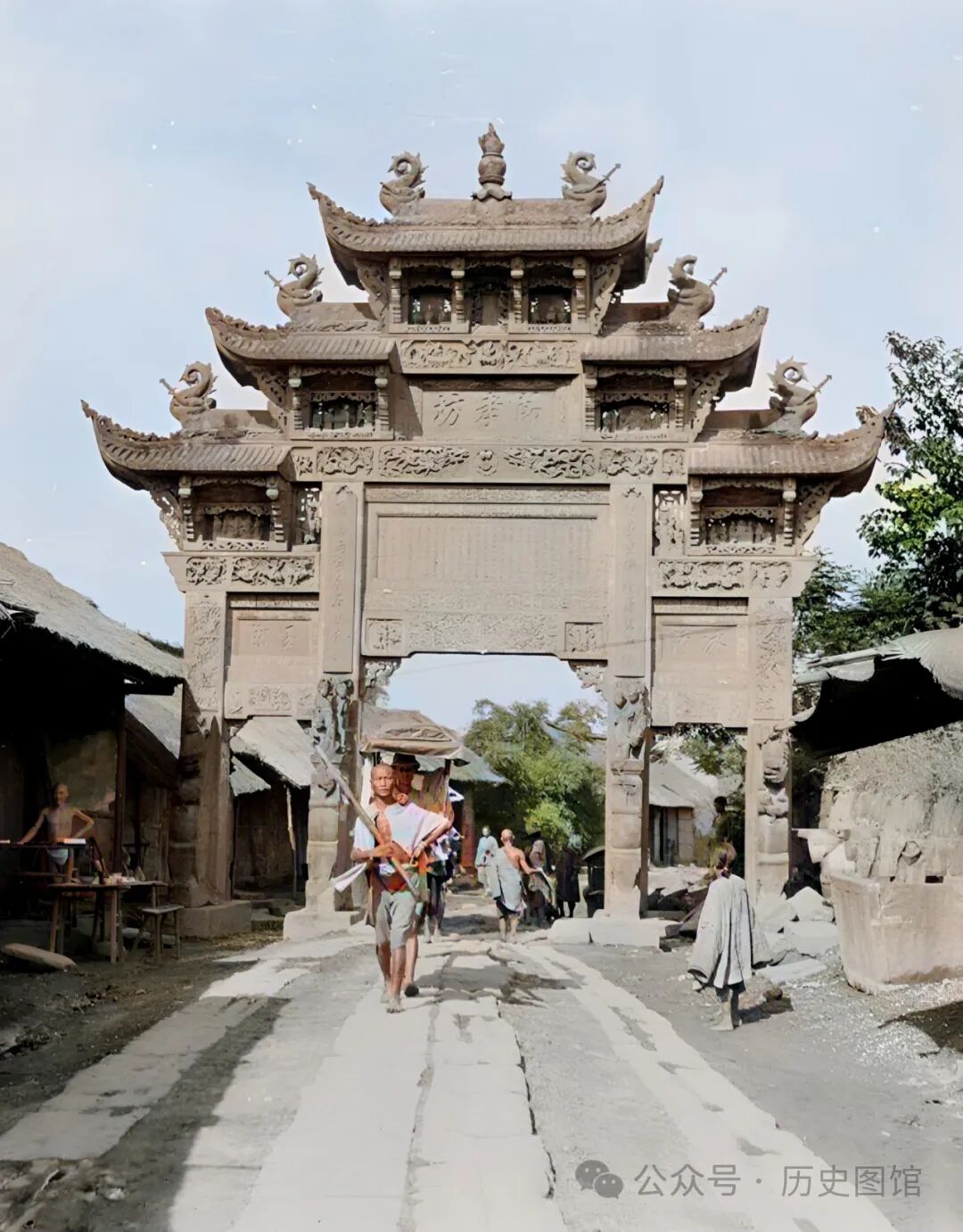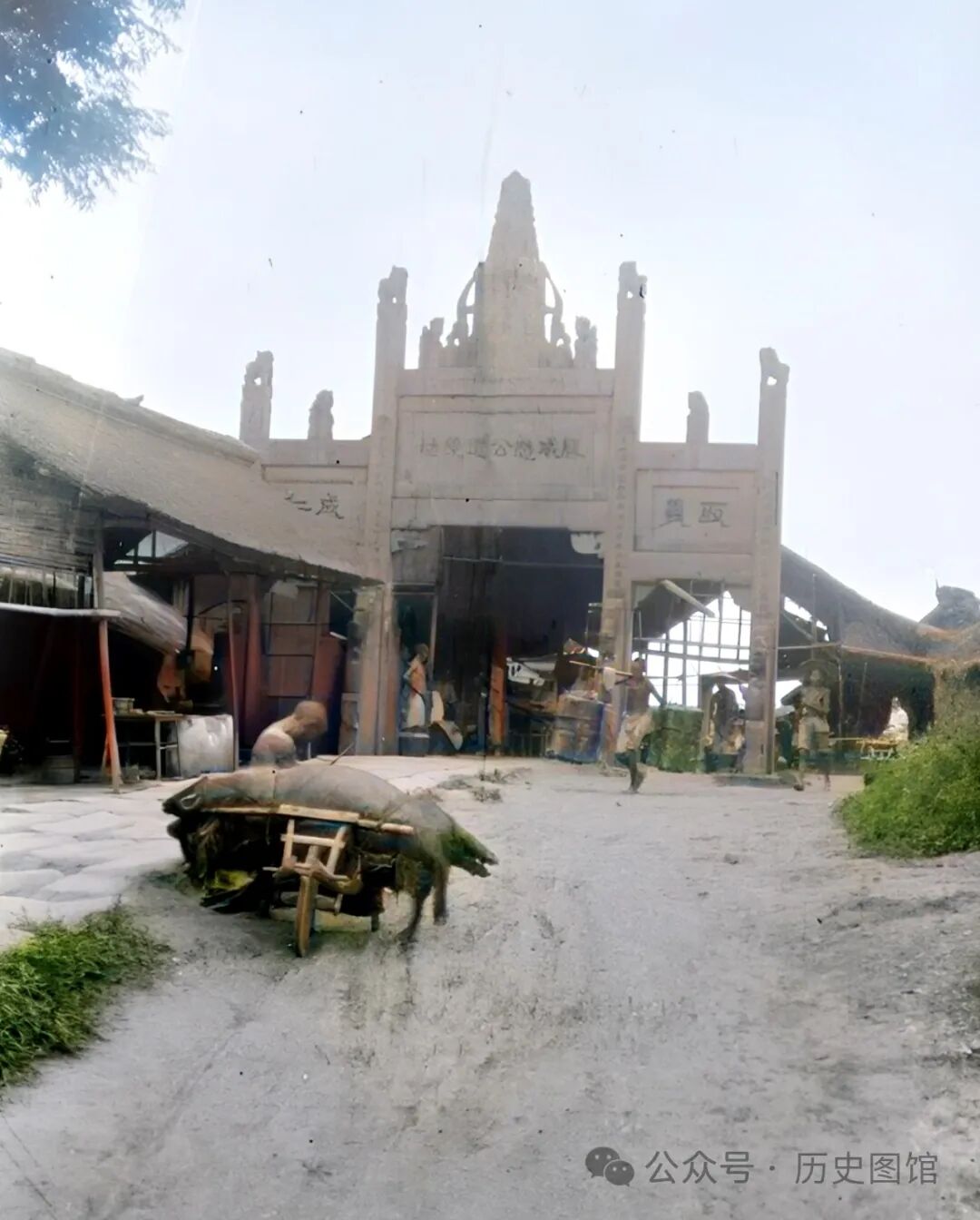 牌坊前是一些商铺,大路上有一名男子坐在路边石头上休息,在他的独轮车上,装着两头猪,想必是去集市上售卖。远处,还有一名挑夫从街头走过。