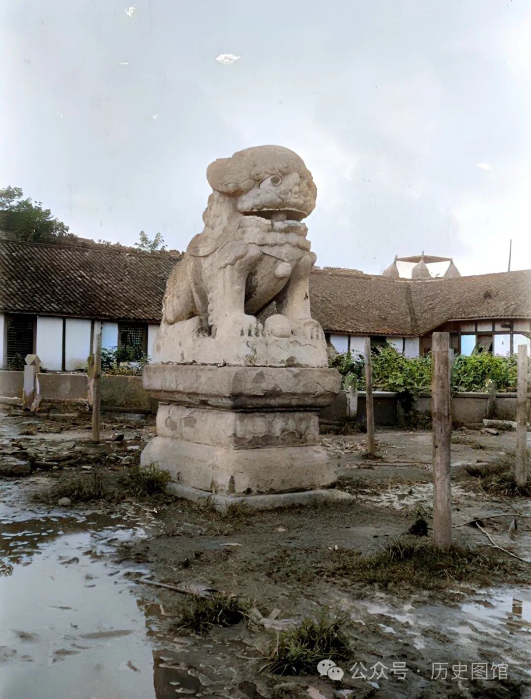 这张照片,拍摄于四川督军署院内。院子中央矗立着一尊石狮子,石狮子放置在须弥底座上,目光威严霸气。房子粉墙黛瓦,房前建有有花坛。下过雨的地面十分泥泞。