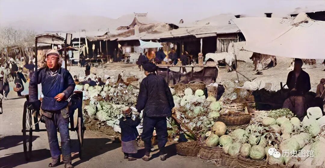1937年1月,张家口一处菜市场景象。一些售卖卷心菜的菜贩,正在路边摆摊。一位手牵着孩子的女子正在买菜。