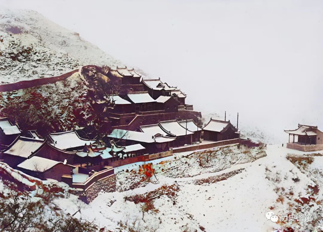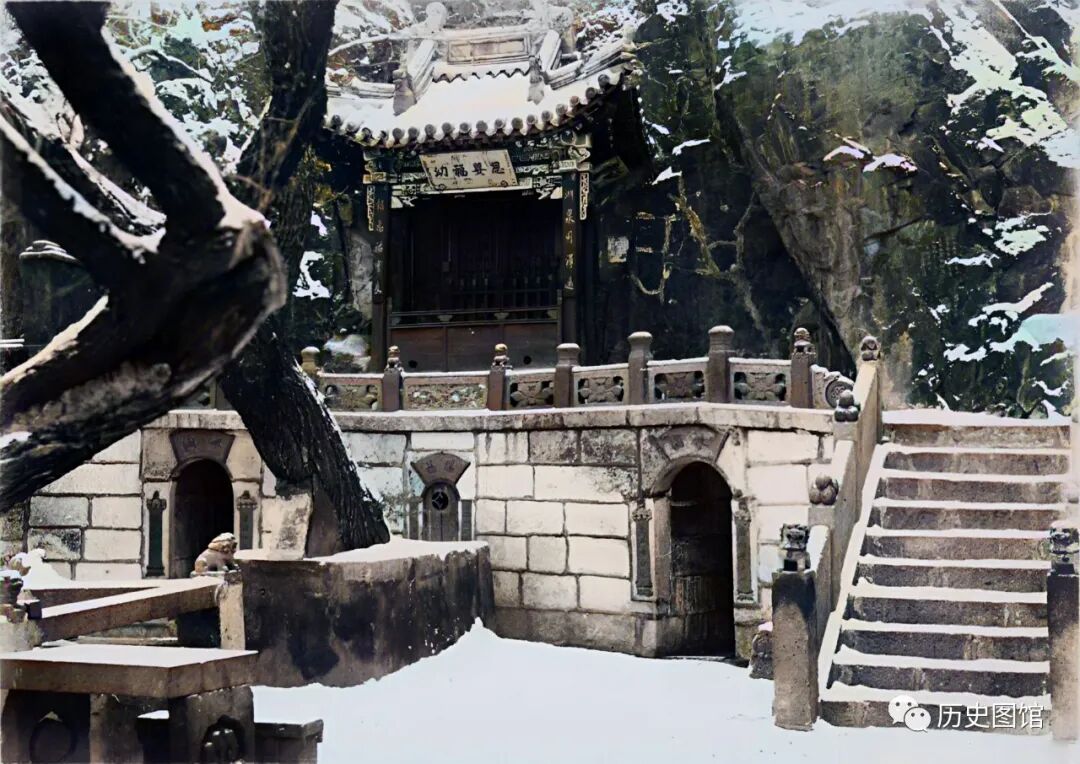 这是1937年的张家口云泉寺风光,照片拍摄于冬季。房顶和地面上的积有厚厚的雪。怪石嶙峋,两棵古柳,形态苍劲。