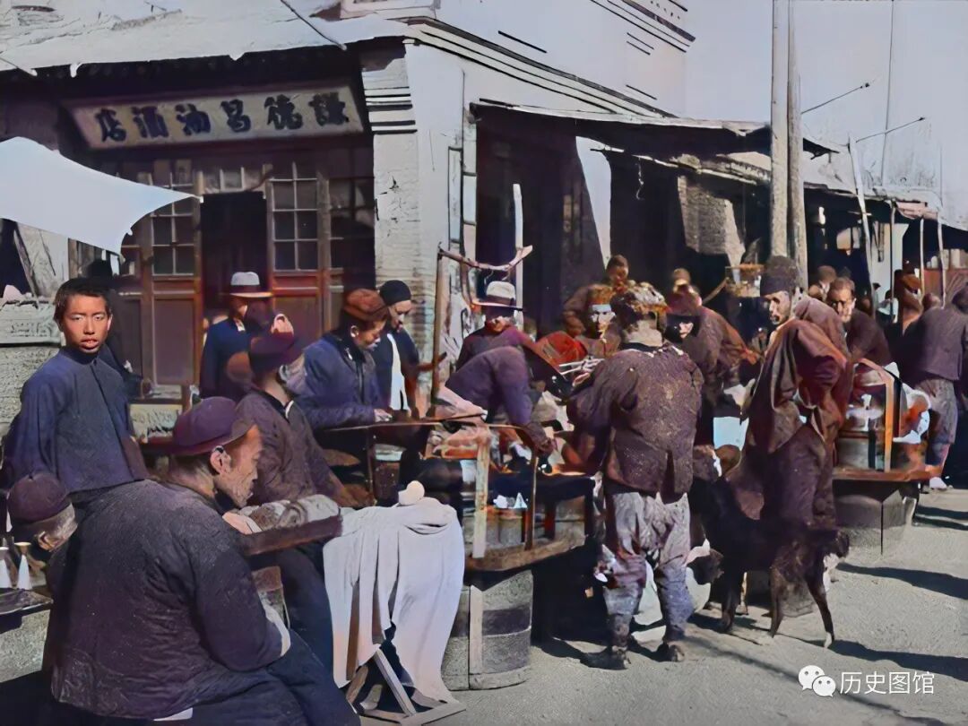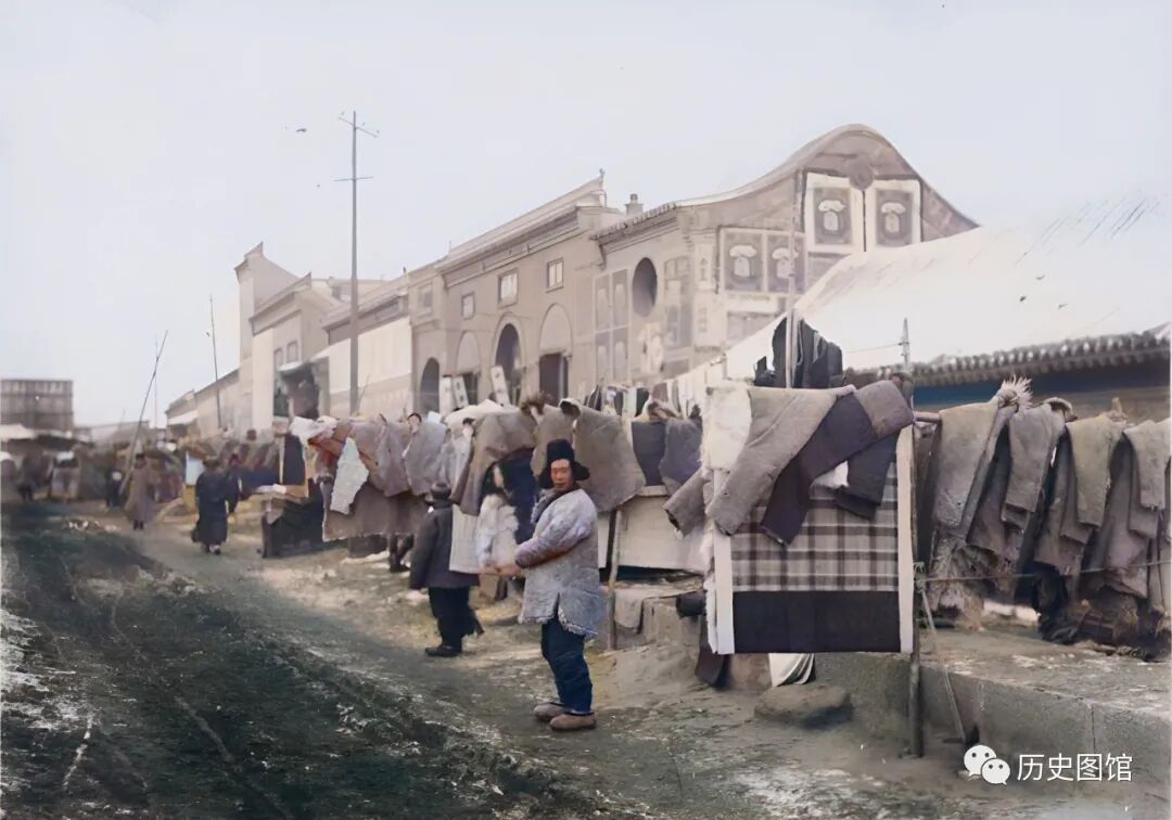 这是当时张家口一条有名小街。街道两旁的店铺,都是做毛皮、皮草生意的。一些商家还把镇店之宝和棉衣挂到门外销售。