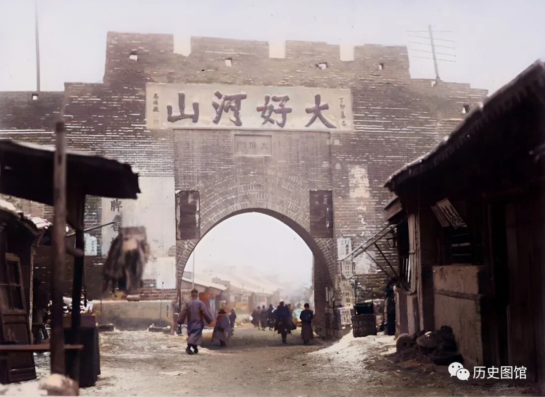 这是1937年1月的张家口大境门。城门高大、巍峨壮观。门楣上四个大字“大好河山”。城门里街道一眼望不到尽头。