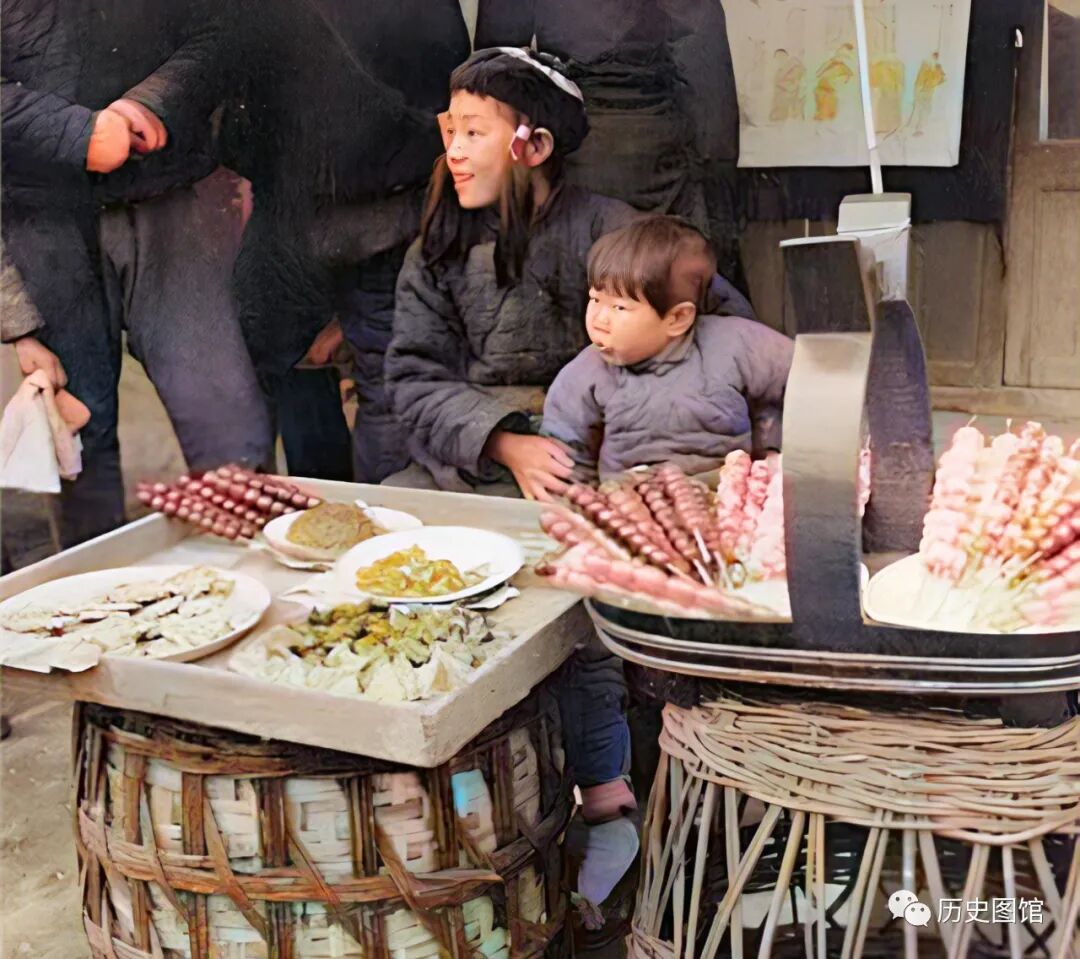 这张照片,拍摄于1937年张家口风怡安街。街边,一个漂亮的小姐姐,抱着自己的妹妹,看守自家的糖葫芦摊位。