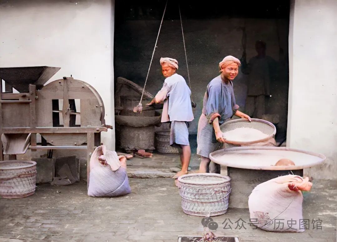 1900年,在永春当地一家大米加工作坊里,两名工人正在忙碌着。他们的工作主要是脱壳和碾米。门口停放着一台木制的脱粒机,一名男子正在屋里筛稻米。另一名男子端的筛子里,白花花的大米,男子脸上露出开心的笑容。