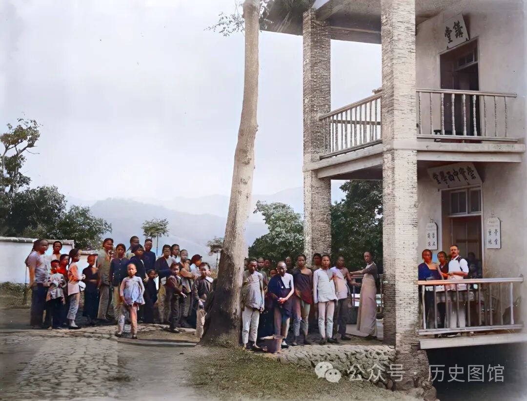 1900年,永春哈迪培训学校里,学生们正在排队接种疫苗。教学楼上悬挂着“崇宝中西医学堂”的匾额,二楼是讲堂。在照片右侧,能清楚地看到,身穿白色围裙的约翰·普雷斯顿·麦克斯韦博士,正在忙碌着。
