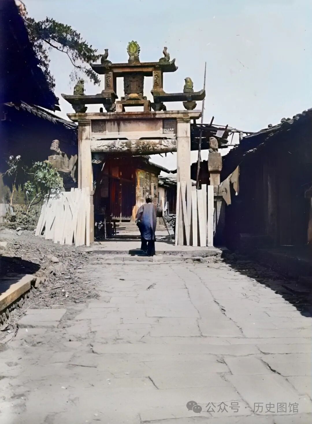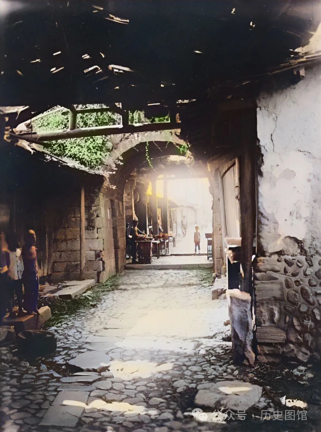 1905年,永春城内的一条老街。街道两侧的房子古色古香。还能看到用石条垒砌而成的小城门,连地面上也铺着鹅卵石。几个孩子站在路边的台阶上。