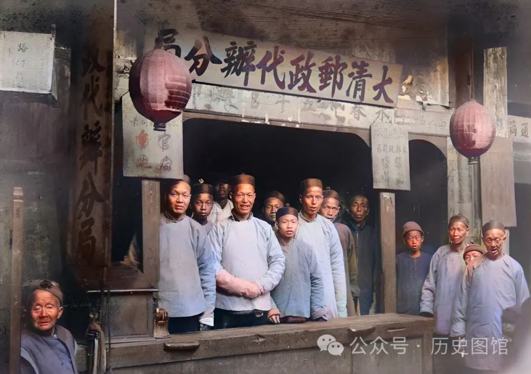 1904年,位于福建永春的邮政局。门头上方匾额上书“大清邮政代办分局”字样,窗口左右两侧悬挂的竖牌上分别写着:官局重地、禁止喧哗。一群工作人员站在柜台前,笑容可掬服务态度很好。