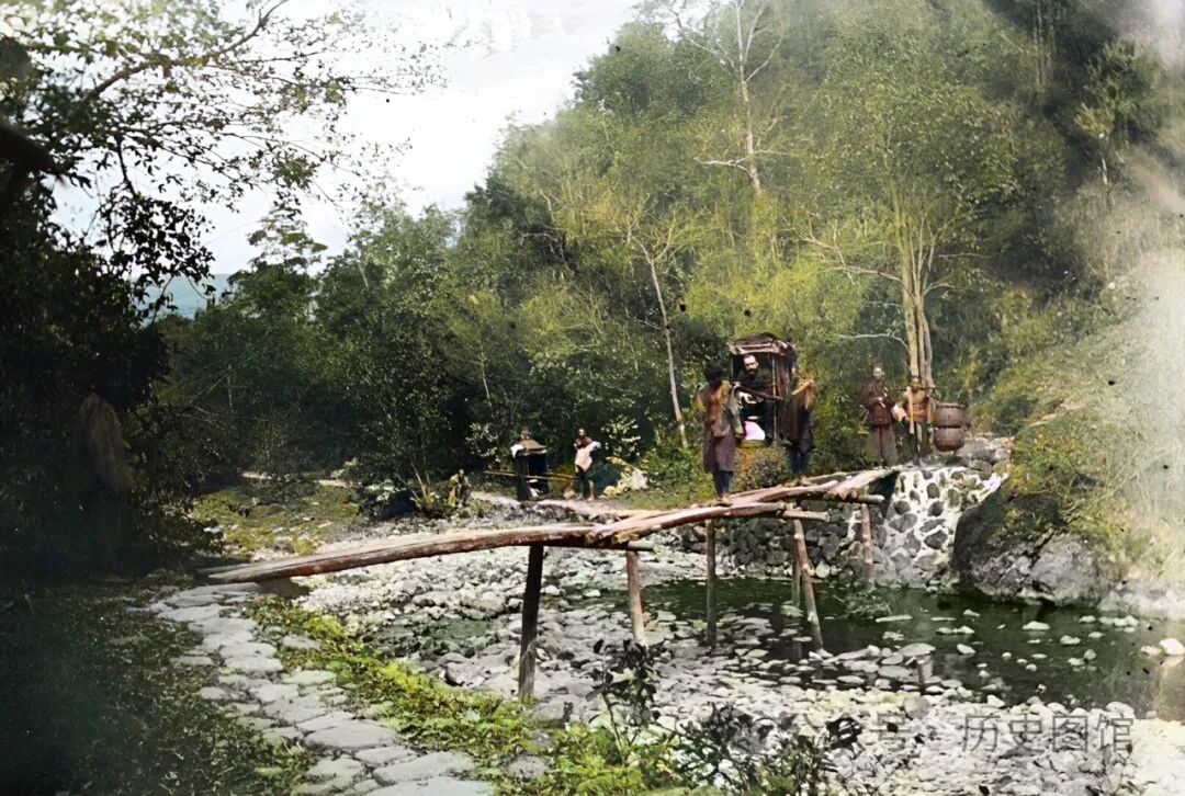 1910年,约翰·普雷斯顿·麦克斯韦博士乘坐轿子,在永春当地的山上采风。在经过一座木桥时,拍下了这张照片。照片中的麦克斯韦博士手里还拿着一本书。