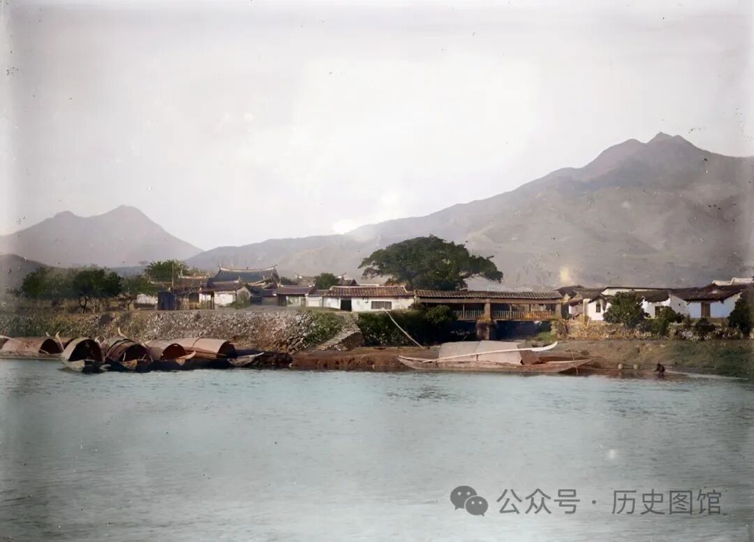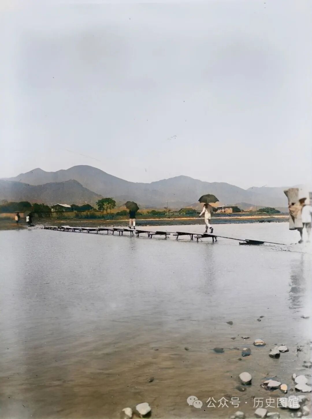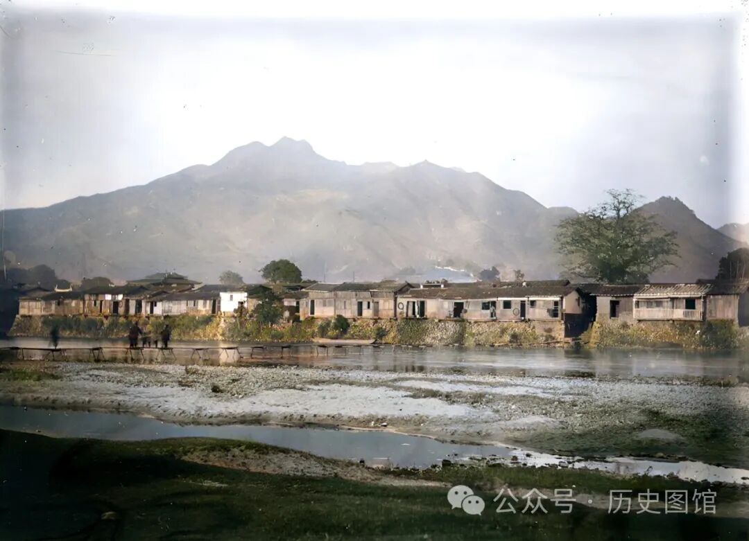 1900年,永春桃溪两岸风光。此时正处于枯水期,露出了部分河床。有一座简易木桥横跨在河道上,河对岸是一座座民间。远处的大山,在薄雾中时隐时现。真是太美了!
