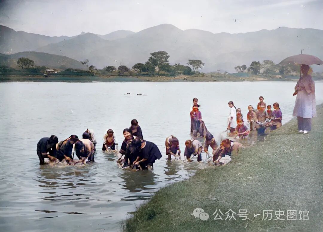 这张照片,是永春女校的学生们在河里洗衣服。女学生们年龄有大有小,穿着不同的服装。举目望去,远处青山连绵不绝,近处河水清澈,学生们的欢笑声,风景太漂亮了。