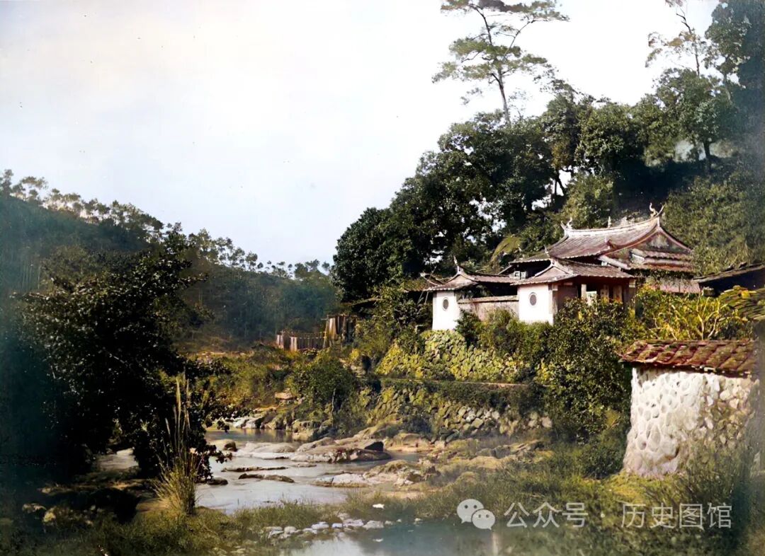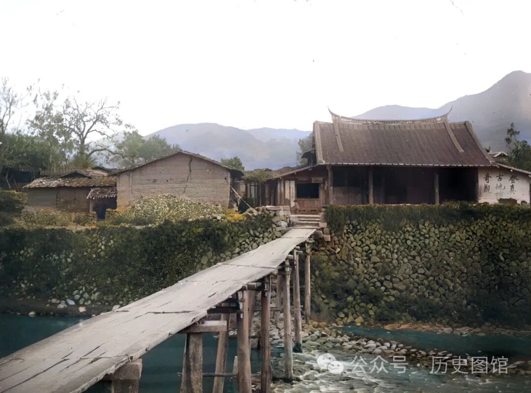 1900年,永春蓬壶附近的一座木桥。这里风景秀美,酷似蓬莱仙境,故称蓬壶。走过木桥到达河对岸,看上去像是一座道观。
