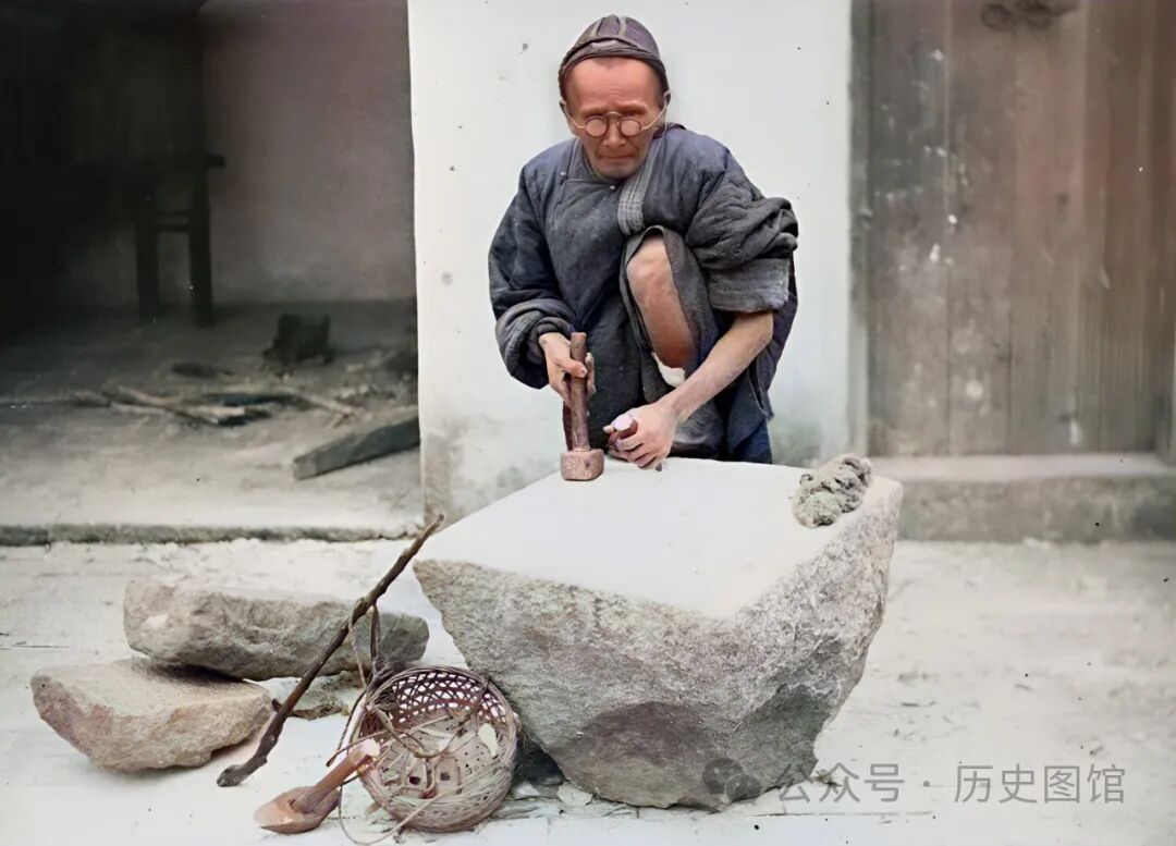 1900年,,永春当地的一名石匠,正在雕刻花纹。这是一名老石匠,戴着一副眼镜,眼睛深邃。在他面前的竹筐里,装着几个锤头。