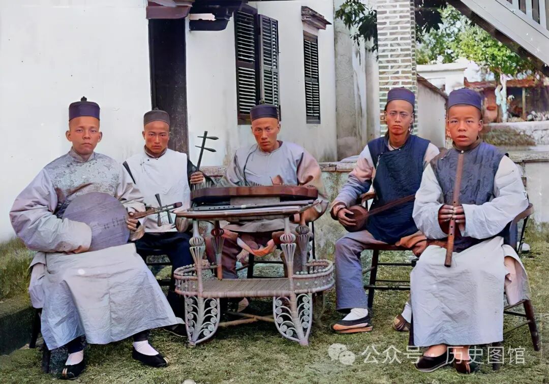 这是永春当地的五名乐师,他们受约翰·普雷斯顿·麦克斯韦博士的邀约,到他的别墅里演奏。这群乐师使用不同的乐器,乐器从左到右依次为:弹拨琵琶(可能是月琴、阮或中阮);板胡、野胡或二弦子;扬琴;三弦或二弦子;箫。