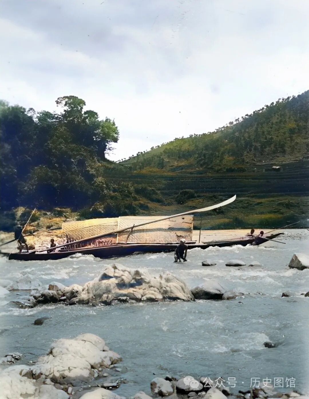 1904年,一艘小舢舨正在穿过溪流的浅水区。舢舨很窄也很长,上面是用席子搭建的棚子。将小舢舨开过这样的急流浅滩区,需要高超的驾驶技术。