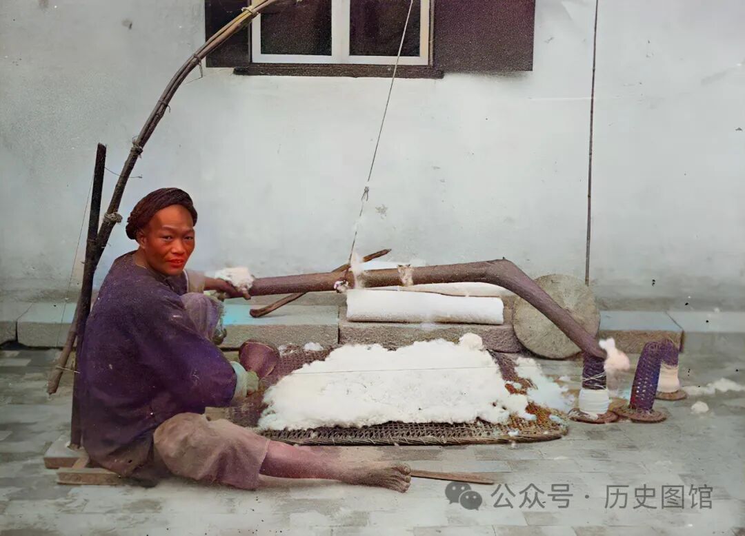 1900年,一名男子坐在地上,面前的席子上摆放着一些棉花。他正在使用特制的工具弹棉花。这种纯手工弹棉花的方式,在六七十年代的农村还能见到,现在已经见不到了。