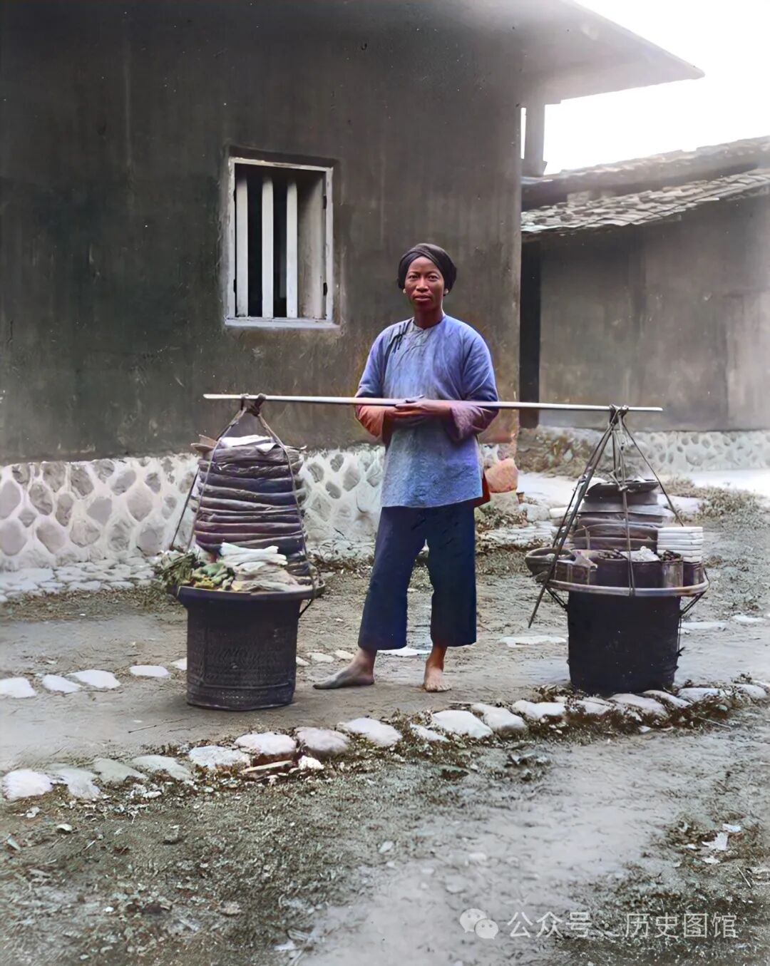 1906年,永春当地街头的一个流动小吃摊。男子光着脚,挑的扁担两头,装着很有当地特色的美食小吃。他走街串巷,沿路吆喝,只要有人想买,他随时停下来。摄影师为他拍下了这张照片。