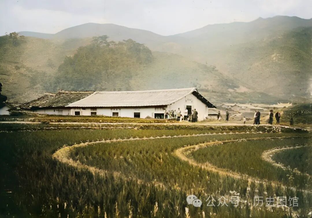 1906年,永春郊外的一处风景。山脚下是一个村落,一栋栋民房鳞次栉比。在照片的中景位置,有一座巨大的白色建筑,那是一座教堂。一些当地人站在建筑前。