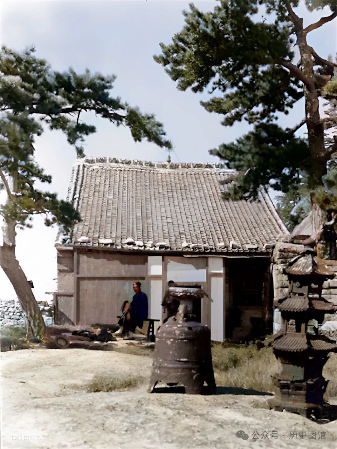 1935年,在华山一座道观前,矗立着几棵苍老遒劲的松树,树下有一名道士坐在板凳上,他身穿道袍手拿拂尘,想必是一位世外高人。道观前的空地上,有一口大铁钟和铸铁塔炉。