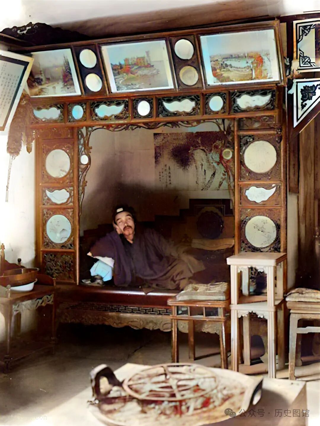 1935年冬,在华山的一座道观里,一名道士正依靠在床上休息,室内陈设古色古香。在屋子中间,红红的炭火烧得正旺。