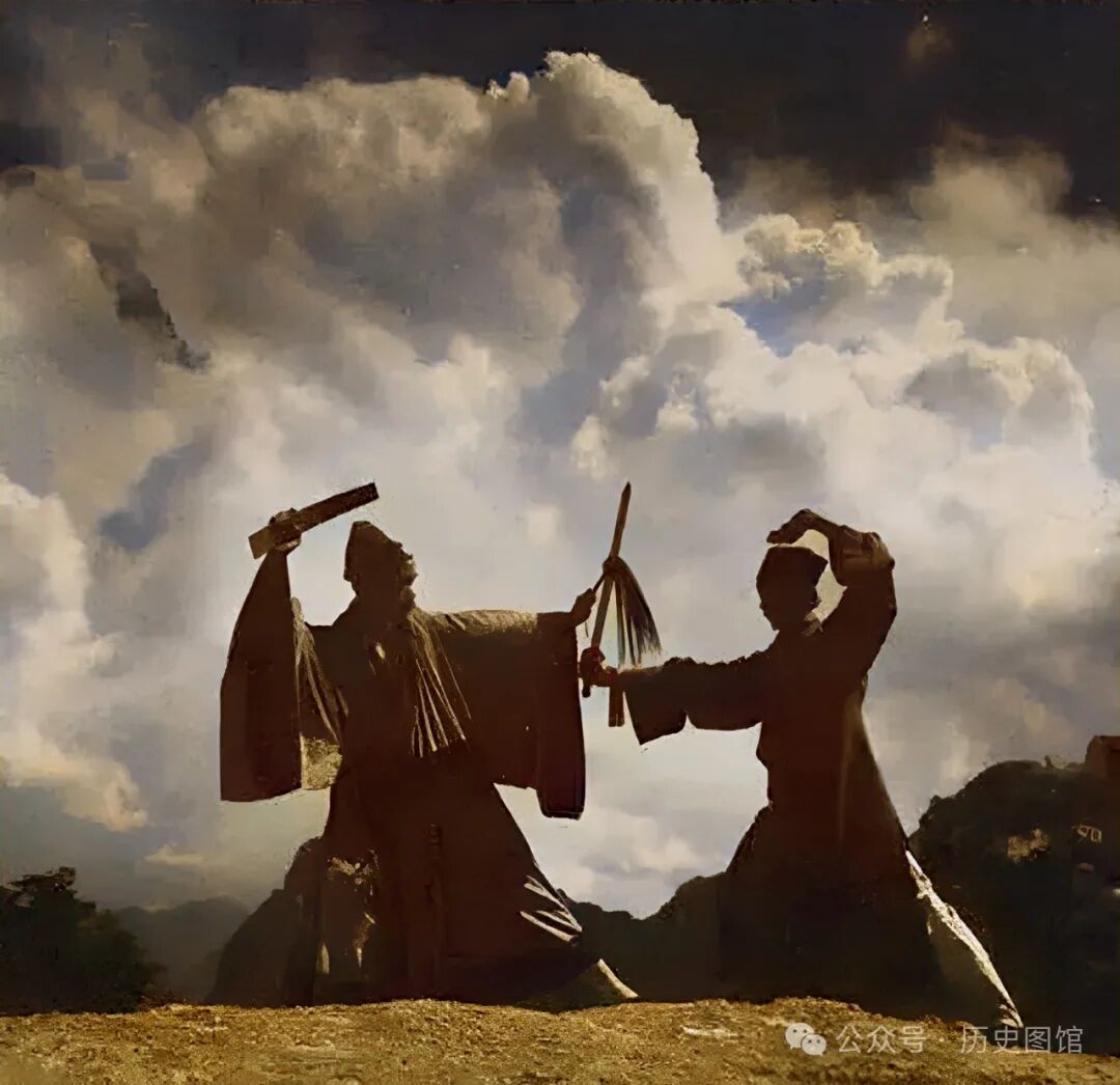 1935年,华山两名道士在山上练武。他们身穿道袍,一人手持拂尘,另一人用剑。两人招式凌厉,攻守有方。这架势,不禁让人想起了电视剧中的“华山论剑”。