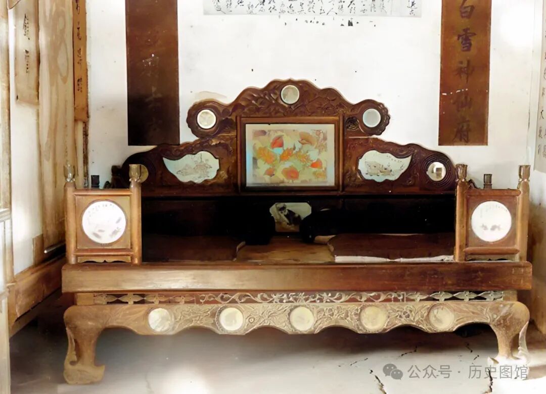 道士住宿的房间叫“云房”,这是云房内的一个坐榻,也叫云床。制作非常精美,雕刻着吉祥纹饰。坐榻后面的墙壁上,还有一副对联。
