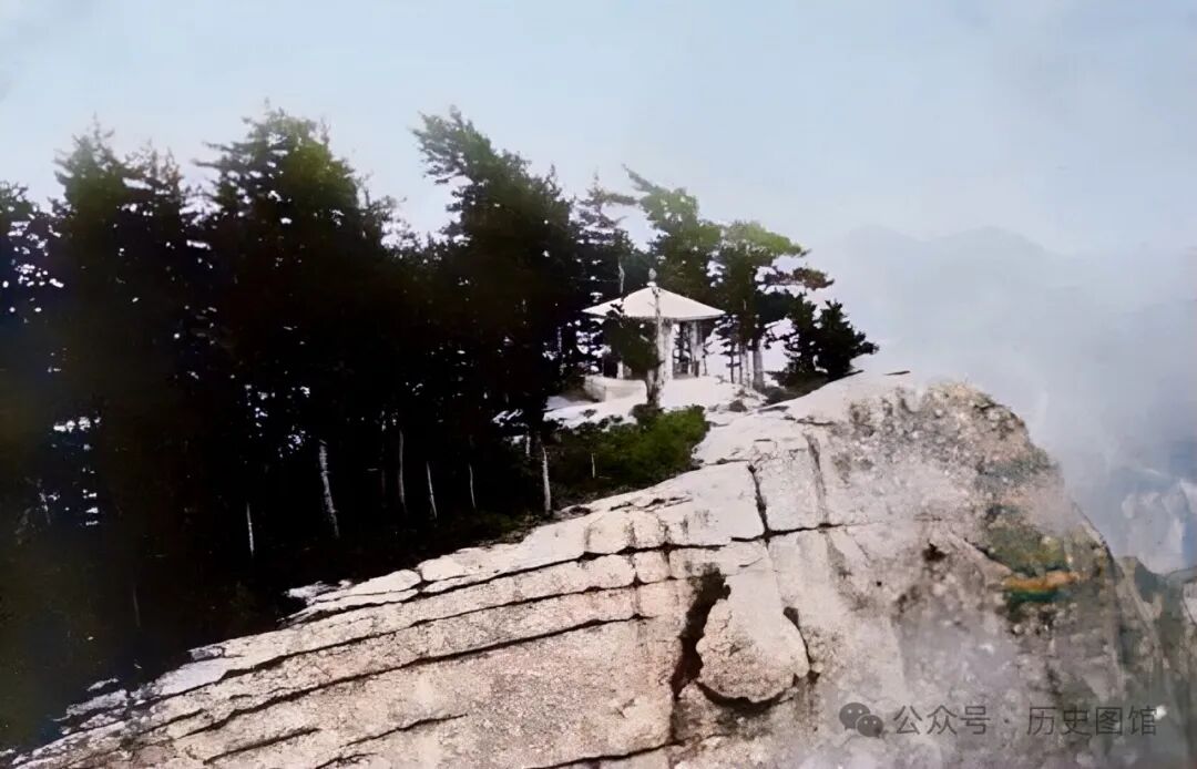 1935年,华山松桧峰美景。峰顶之上,乔松巨桧参天蔽日,最高处有一座八角亭子——松桧亭。向南望去是连绵起伏的群山,能够真正领略到什么叫一览众山小。山峰下云雾缭绕,宛如仙境。