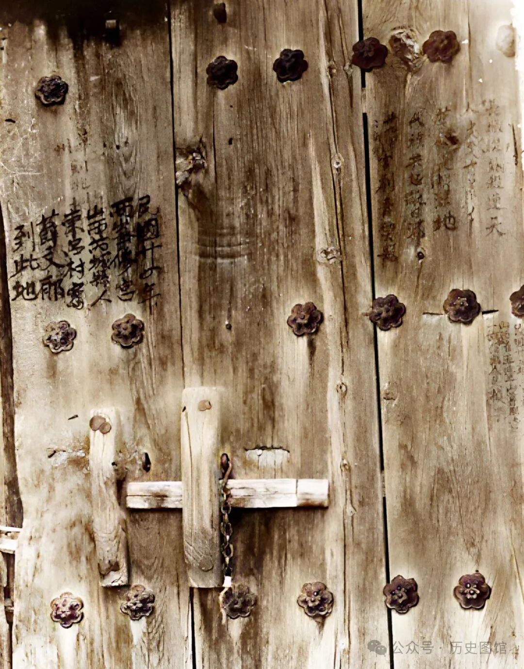 华山一座道观的大门内侧,木门上有金属门钉、木制的门栓和锁链。细细看,门上有人留下的很多字迹。“民国二十四年,西峰修宫,山西芮城县人,东吕村薛文郁郁到此地。”另外两处文字,看得不是很清楚。