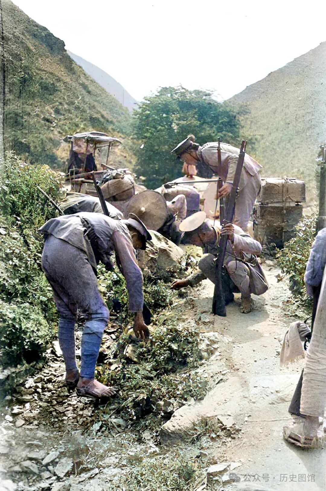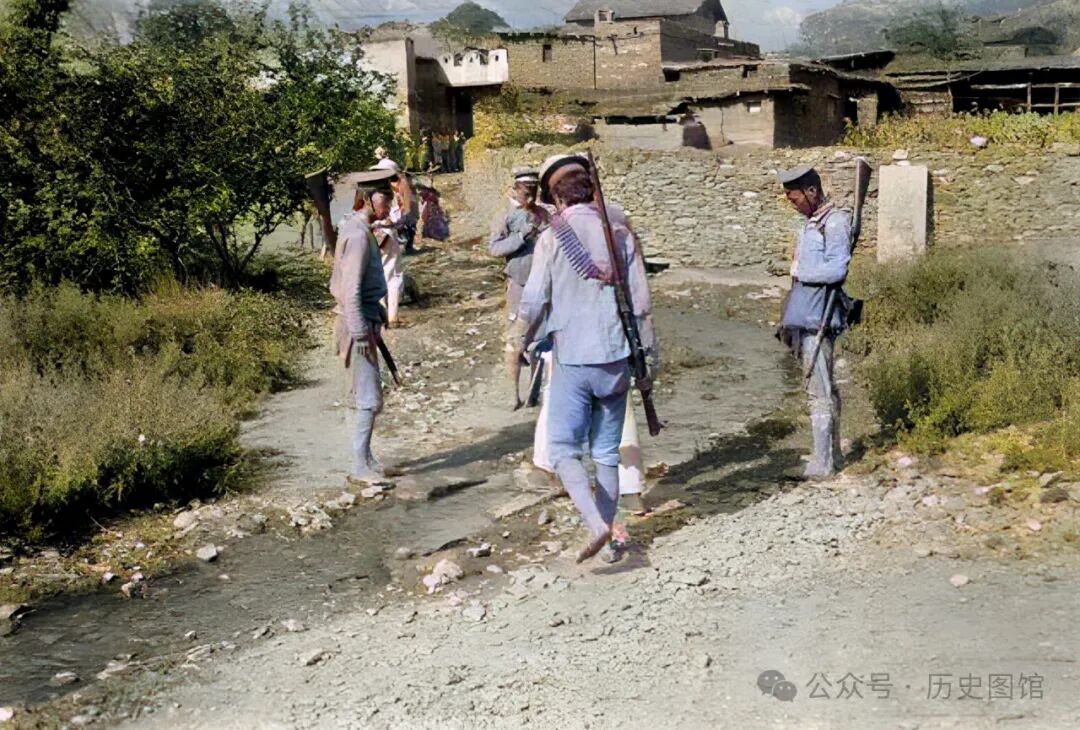 民国时代,军阀割据混战。甘博在茂县考察期间,为了安全起见,当地政府给他配备了几名护卫。这些士兵寸步不离,一路护送甘博翻山越岭,走街串巷。照片中,他们正在跨越当地土寨前的一条小溪。