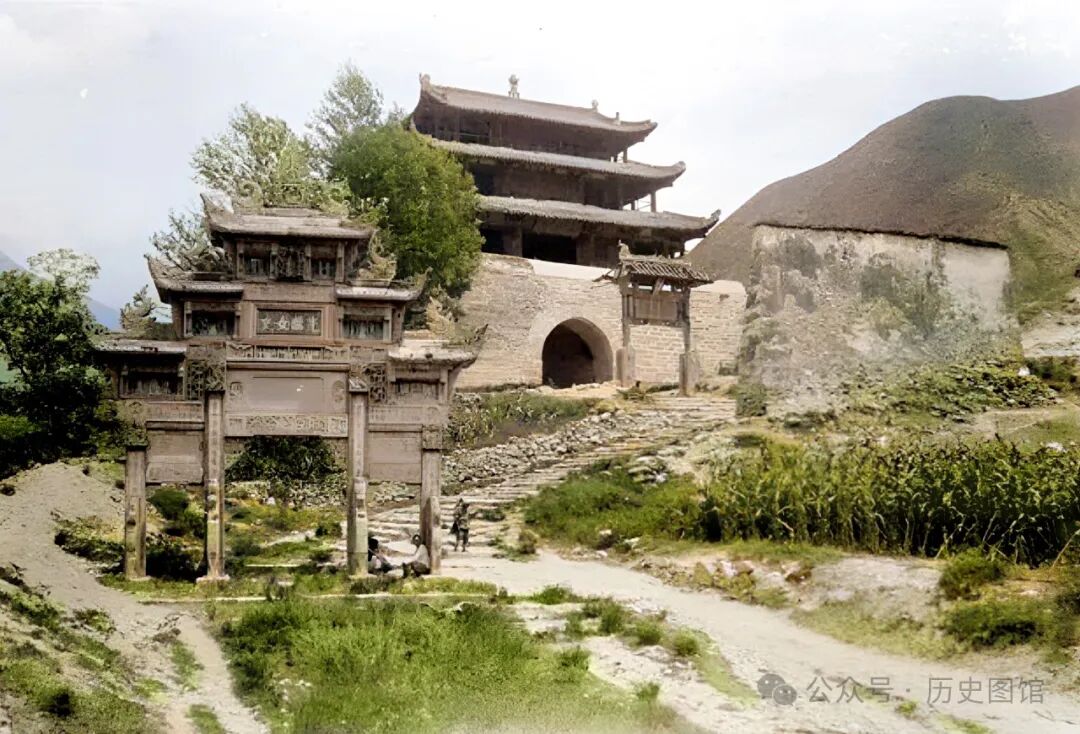 1917年,四川茂县城门前景象。城楼高大壮观,前面立有一座木牌坊和照壁。在城门不远处还矗立着一座三间四柱牌坊,上书四个大字“光昭女史”,旌表茂县一贞烈女子。