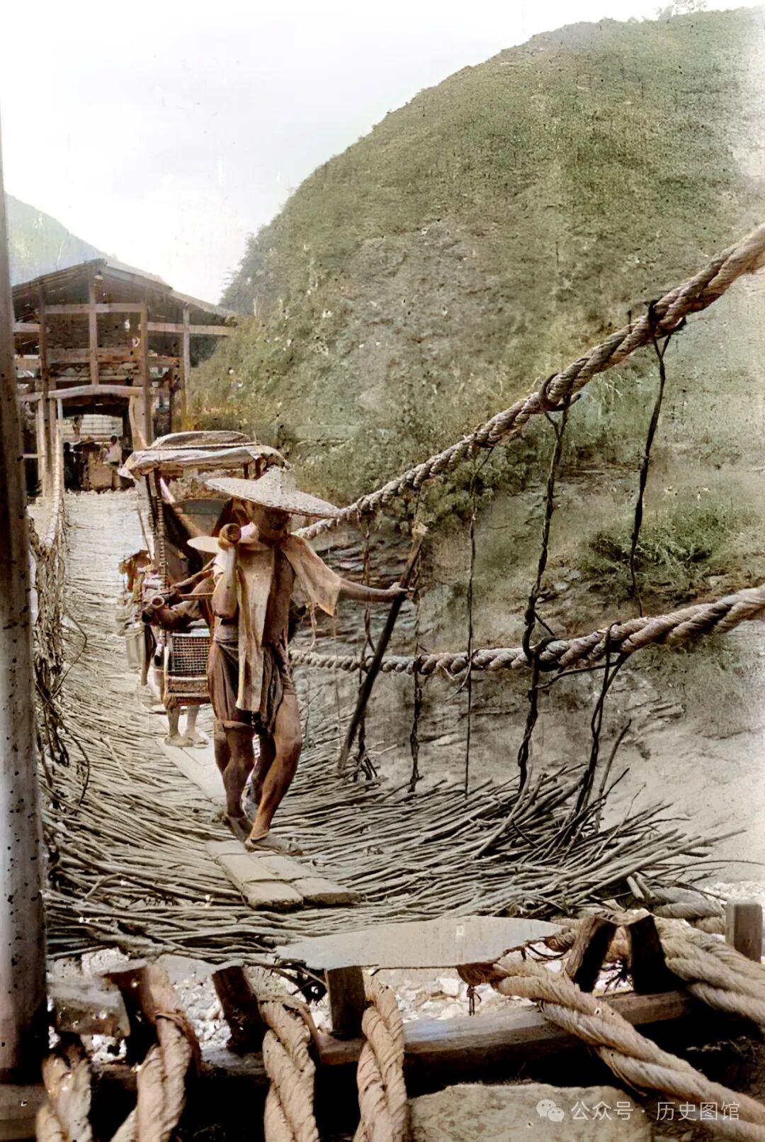 这是位于茂县境内的另一条悬索桥。两名轿夫正抬着轿子从桥上走过。桥面上铺着荆条和木板,走在上面晃晃悠悠的,轿夫边走边扶着桥上的绳索。