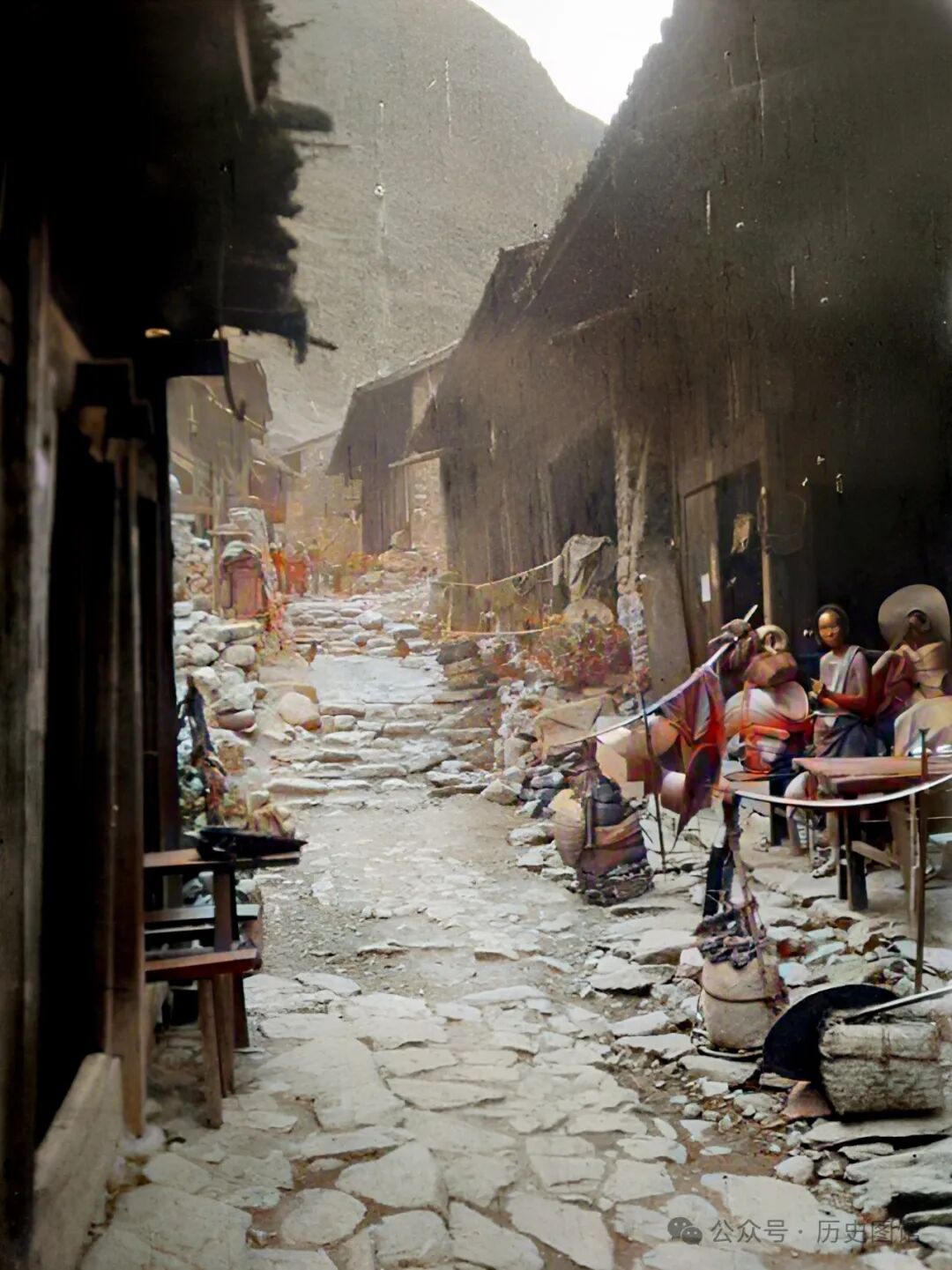 1917年,位于茂县白水寨的一条小街道。路面很窄,铺着石头。街道两侧是传统的木制房屋,沿街店铺都在开门营业,几名挑夫放下担子,站在屋檐下休息。街道尽头处,一座大山高耸入云。整个街市古色古香,很有年代感。