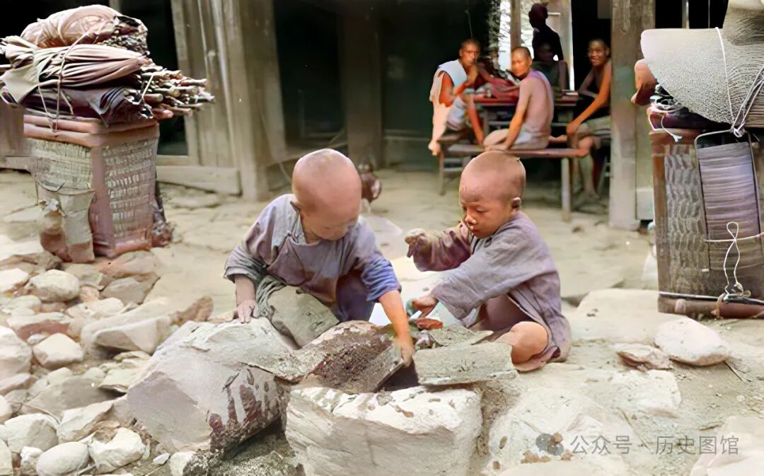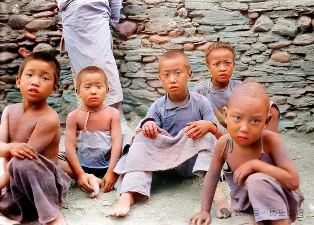 1917年,茂县几名孩子在墙根前玩耍。他们四五岁光景,光着脚,好奇地看着甘博手中的照相机镜头。这些孩子有着健康的皮肤,脸上透露着天真无邪。