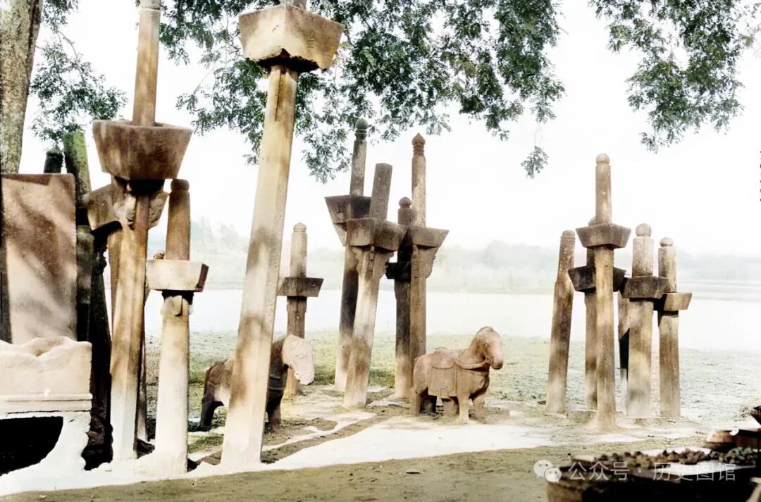 这是位于江边的一处景观,地面上插着很多像宝剑一样的石头柱子,柱子顶端的方形石头上,还刻有文字。这些石柱高低、大小不一。在石柱中间,还能看到一些动物的石像生。想必这里是一处陵墓所在地。