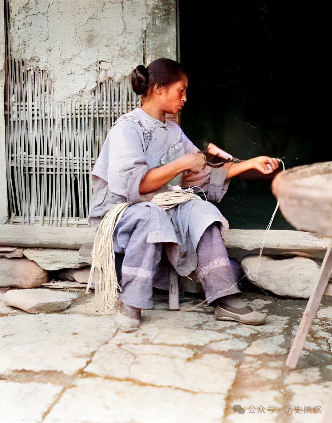 茂县当地一名女子,坐在自家房屋前忙碌着。她正在借助工具,将麻绳捻成几股,然后再将几根细绳捻在一起,成为更粗的绳子。