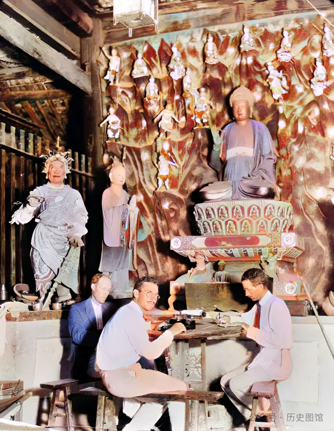 两名助手也在旁边用笔作记录。他们工作时用的桌子,竟然是佛像前的供桌。