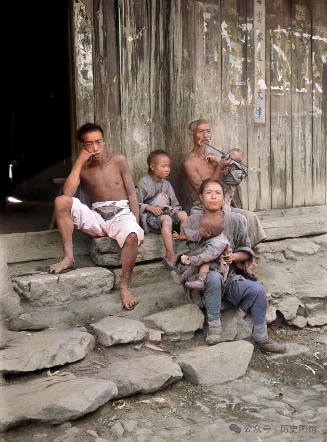 1917年,茂县一户人家,祖孙三代正坐在房前休息。从他们身上穿的衣服看,属于清贫家庭。但是,一家人脸上露出的是难以掩饰的乐观精神。生活很具体,一家人共享天伦之乐,清贫又算得了什么呢。