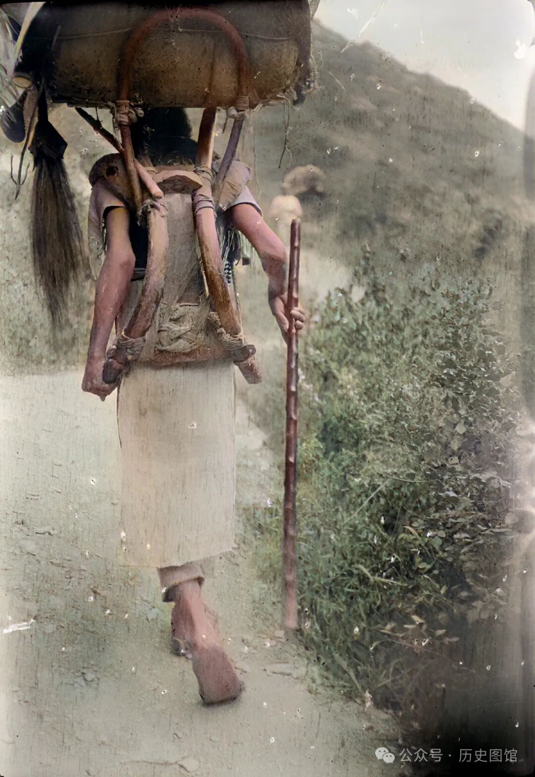在山路上,一名男子背着沉重的货物向前走。他身上这个木架设计得很精巧,可以承重大量货物。背夫的工作很辛苦,依靠这门生意,也能养家糊口。