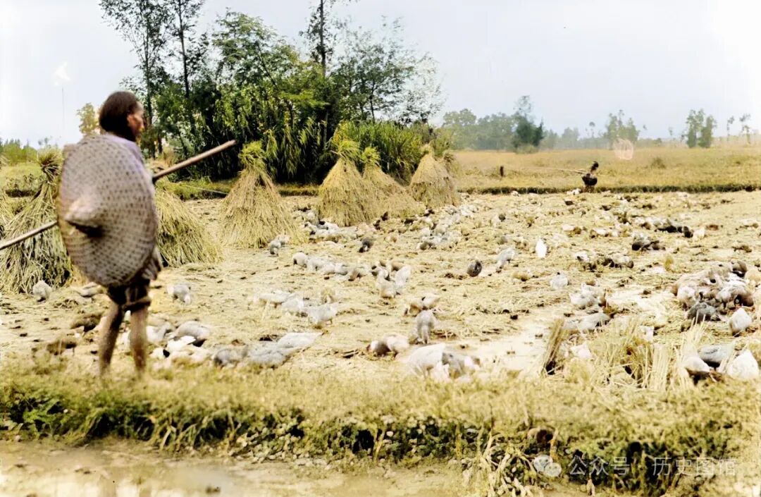 金秋时节,在茂县郊外的的一处农田里,一名男子正赶着鸭群在地里放牧,他一手拿着竹竿,身后背着一个巨大的斗笠。此时,地里的水稻已经收获完毕,田陇上堆着一些草垛。一大群鸭子在地里觅食,一派田园生活气息。