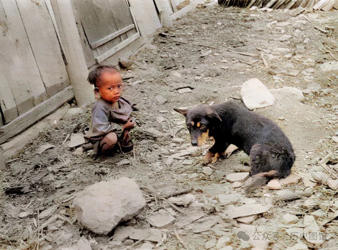 茂县当地一名小男孩,蹲在房屋前和自家的小黑狗玩耍。小男孩第一次见到外国人,眼神中透露了出不可思议的深情。小黑狗也不怕人,扭过头看着甘博一行人。