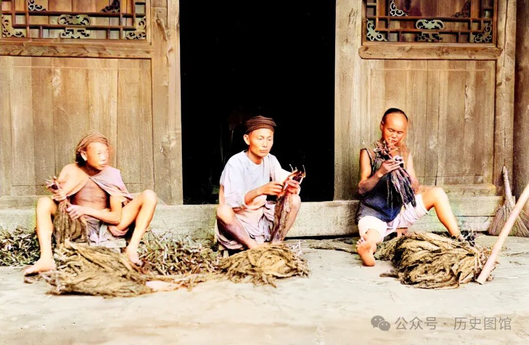 1917年,茂县一栋民房前,三门男子正在整理烟叶。他们将烟叶捆扎起来,方便烤制和运输。史料记载,烟草从明代传入,清代已外销。当时烟草以土烟为主,二三十年代已冠于全国。