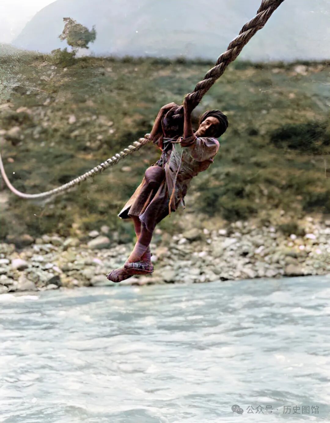 甘博在岷江岸边,看到了这样一幕:宽阔的岷江上,悬着一根粗大的绳索,一名当地人将自己固定在溜索上,依靠位置高及惯性,迅速到达岸边。这种过河方式,让甘博觉得很神奇,就在这名男子乘坐溜索即将到达岸边时,拍下了这张照片。