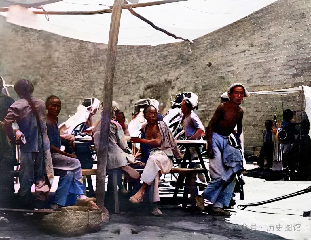 1909年,在沈阳的城墙边,几名黄包车师傅坐在遮阳伞下休息,等待载客。天气炎热,他们有的光着上身。拉车很辛苦,但是为了生活,他们毫无怨言。
