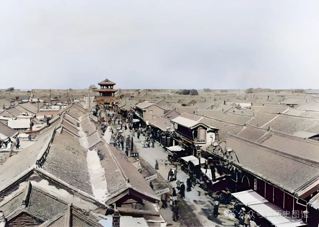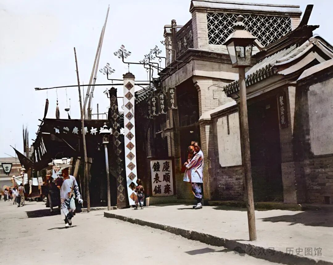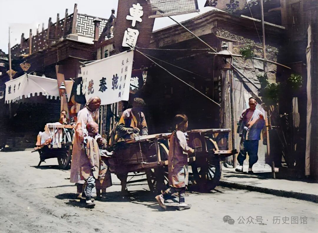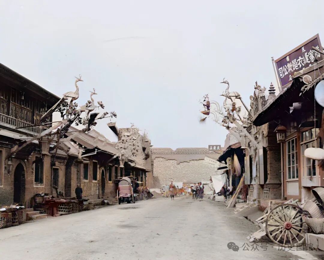 清朝末年,沈阳一条街道上的景象。街道笔直,路两侧的建筑古色古香。沿街店铺都在开门营业,门口的展示有精美的木雕招牌。有牡丹、仙鹤等造型,应该还是彩绘的。这样独特的照片,老远就能看到,非常醒目。