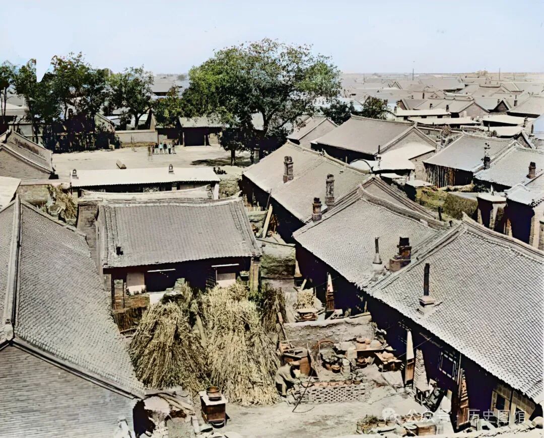 站在一处楼阁上,俯瞰沈阳城区。下面是一个四合院,房屋为砖瓦结构,朝阳的房子为正午,厢房是厨房。在矮墙边堆放着很多玉米秸秆,是取暖做饭用的好燃料。正午的阳光照在院子里,充满了生活气息。
