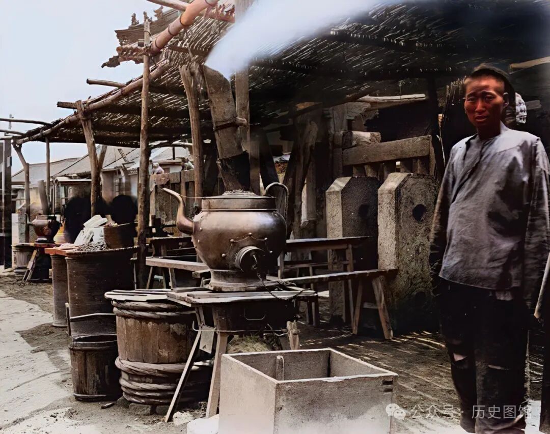 1909年,沈阳城内街边一个茶水铺。炉子上,一个大肚铜茶壶正在烧开水,烟囱里冒出白色的烟雾。掌柜的站在门前,招揽路过的客人。