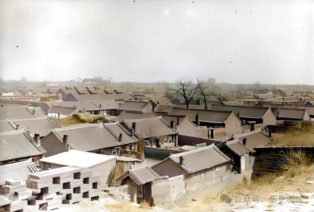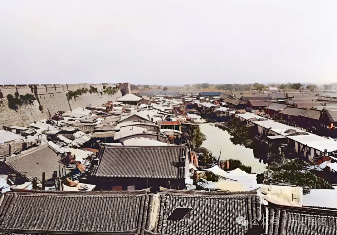 这是站在沈阳东城墙外远眺,左侧是高大的城墙,城墙上的垛口以及远处突出墙体的马面清晰可见。在高大的城墙衬托下,城墙下的房屋显得十分渺小。在护城河的两岸,建有很多民房,有瓦房,也有平房。鳞次栉比,一眼望不到边。