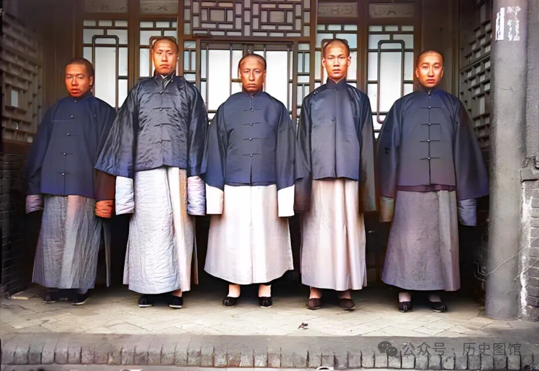 1909年,沈阳当地几名公职人员的合影照。他们穿着相同样式的服饰,站在办事处门前,每个人的表情都很严肃。感觉和清宫剧里演得不太一样。
