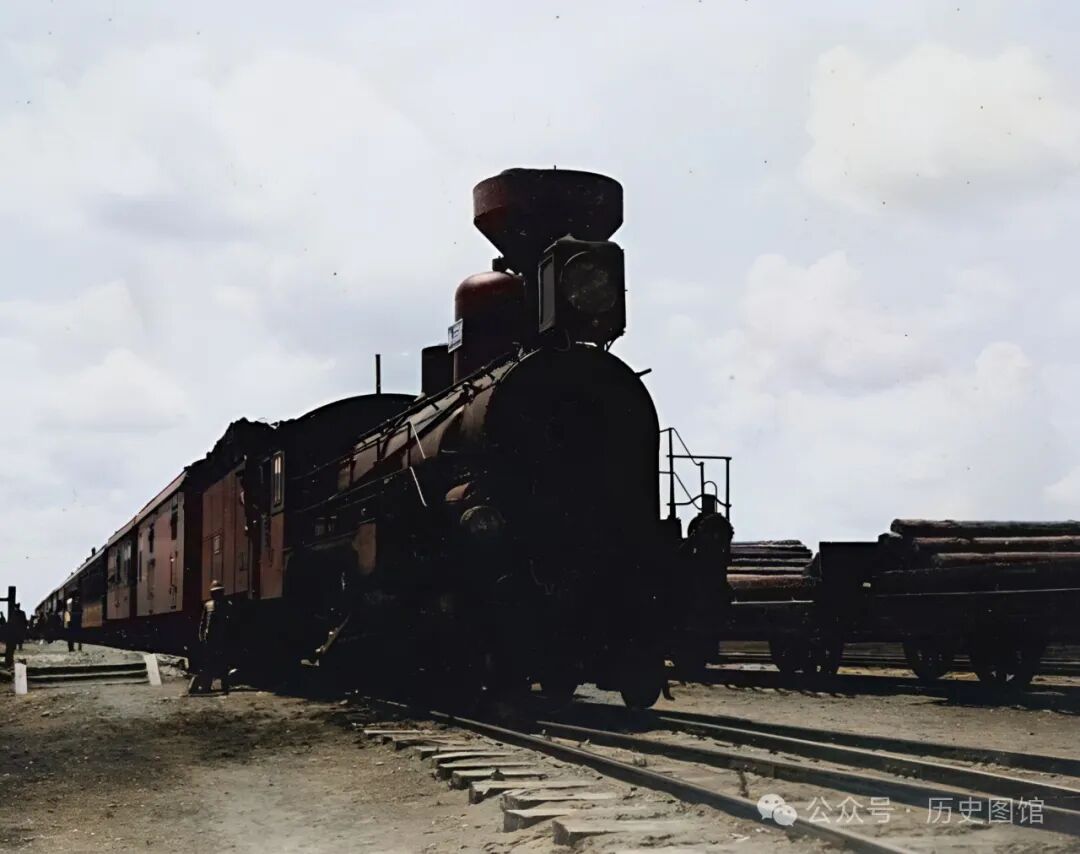 1909年,在沈阳东清铁路线上,一列俄国火车停靠在站点上。1897年,俄国开建东清铁路,1903年建成通车。1905年,日俄战争后,被日军占据改称“南满铁路”。
